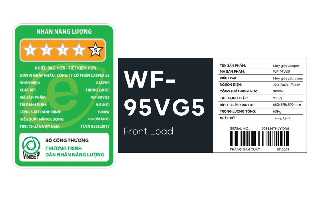 – Nhãn năng lượng 5 sao, hiệu suất sử dụng điện 6.8 Wh/kg.