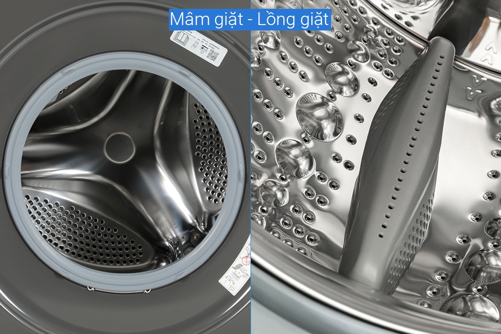 - Lồng giặt thép không rỉ bền bỉ và sang trọng.