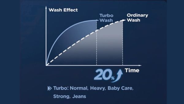 Khi kích hoạt chế độ Turbo, luồng nước mạnh hơn và tốc độ quay nhanh hơn giúp rút ngắn thời gian giặt tới 20%, đồng thời vẫn đảm bảo hiệu quả làm sạch.