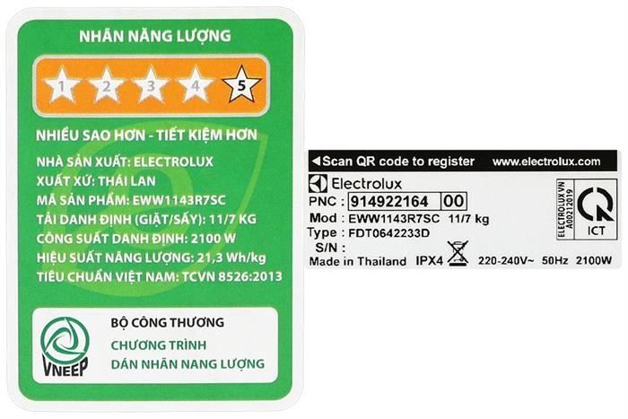 Máy giặt sấy Electrolux UltimateCare 700 Inverter giặt 11 kg – sấy 7 kg EWW1143R7SC có khối lượng giặt 11 kg – sấy 7 kg thích hợp với gia đình trên 7 thành viên. Máy có nhiều công nghệ như: công nghệ Hygienic Care loại bỏ vi khuẩn hiệu quả sau mỗi lần giặt, UltraMix hòa tan chất giặt tẩy,… giúp việc giặt giũ của gia đình bạn được nhẹ nhàng hơn. Đây là sản phẩm đáng cân nhắc dành cho gia đình đông thành viên muốn tiết kiệm không gian giặt sấy.