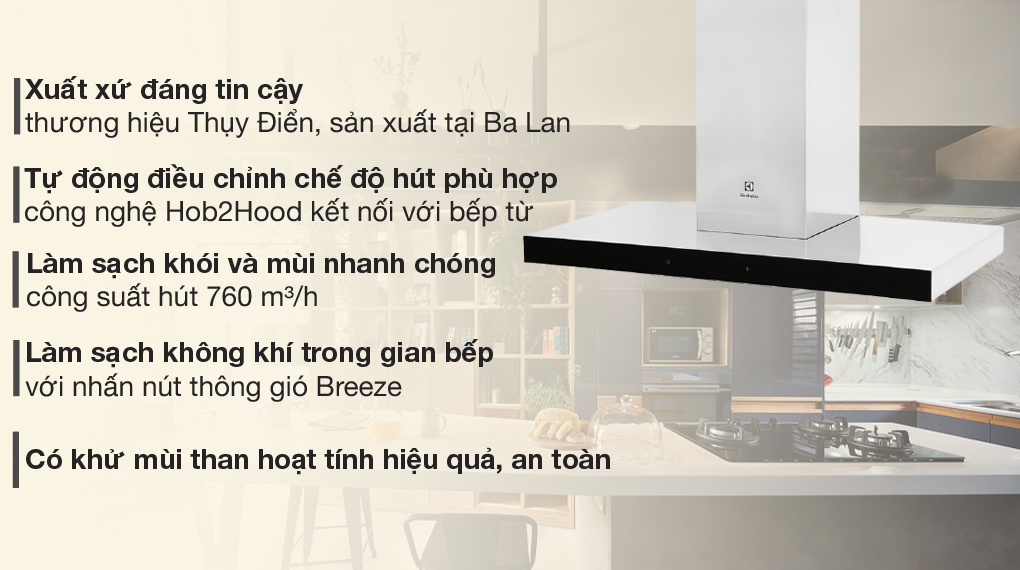 Nhờ vào công nghệ Hob2Hood kết nối được với bếp từ Electrolux có cùng chức năng này, máy sẽ tự động điều chỉnh chế độ hút mùi phù hợp với chế độ nấu tương ứng của bếp giúp bạn không phải bận tâm điều chỉnh máy.