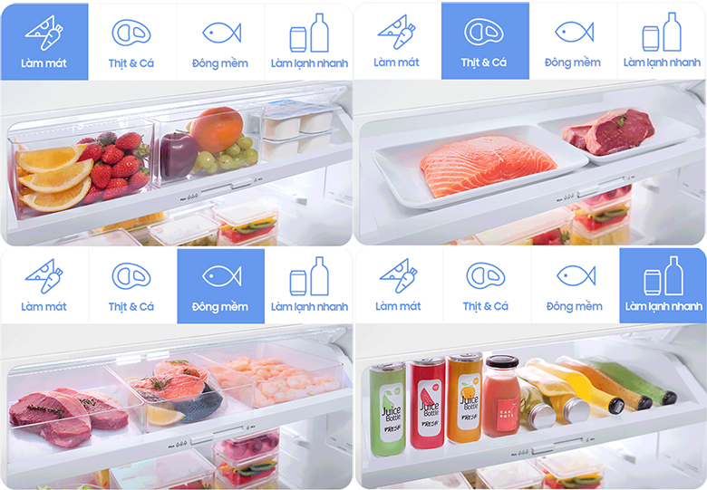 Tủ lạnh Samsung Bespoke RT42CB6784C3 được trang bị Ngăn đông mềm linh hoạt Optimal Fresh+ có thể tùy chỉnh 4 chế độ làm lạnh giúp bạn dễ dàng chuyển đổi theo từng nhu cầu bảo quản: Chế độ “Làm mát” (phù hợp thực phẩm dùng hằng ngày như sữa, thịt nguội…); Chế độ “Thịt & Cá”; Chế độ “Đông mềm” (phù hợp lưu trữ thực phẩm dài ngày hơn chế độ Thịt & Cá), Chế độ “Làm lạnh nhanh” cho đồ uống.