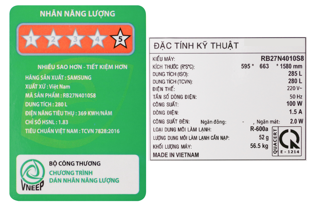 Công suất tiêu thụ công bố theo TCVN:~ 0.13 kW/ថ្ងៃ