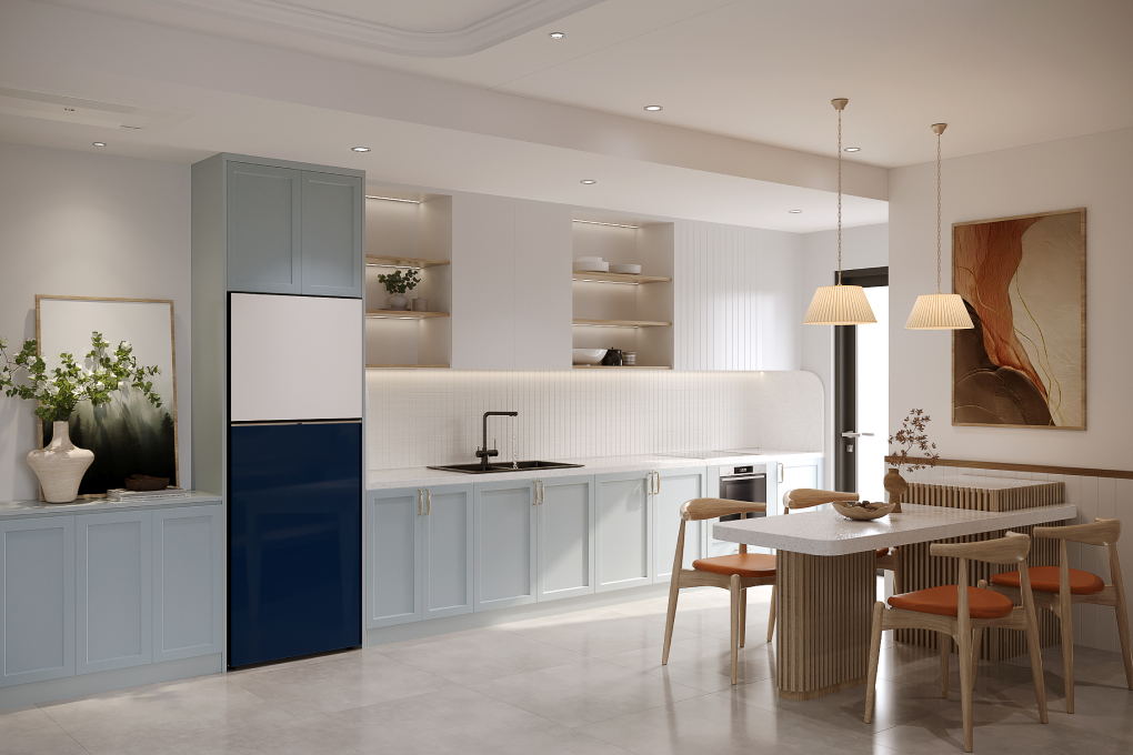 – Tủ lạnh Samsung 2 cửa ngăn đá trên sở hữu thiết kế Bespoke với phối màu Xanh Navy hiện đại, dễ dàng hài hòa với mọi phong cách thiết kế bếp.